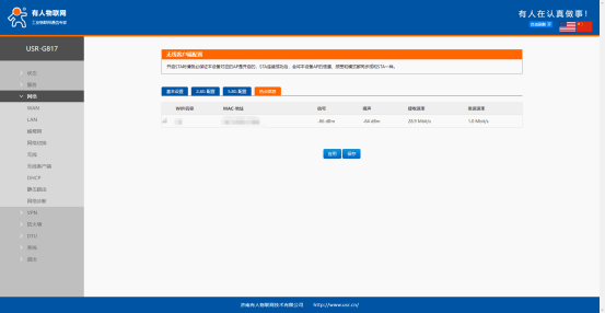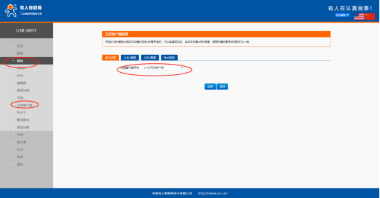 3、進入網絡--無線客戶端,啟用無線客戶端(STA),此功能默認關閉。可以點擊搜索按鈕,搜索當前 2.4G WIFI 熱點。也可以直接填寫wifi名稱等,設置完成后點應用。