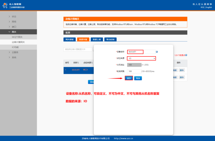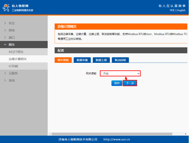 在“網(wǎng)關(guān)”-“邊緣計(jì)算”界面中開啟網(wǎng)關(guān)使能,點(diǎn)擊“下一步”在“數(shù)據(jù)采集界面”配置IO的數(shù)據(jù)點(diǎn)。