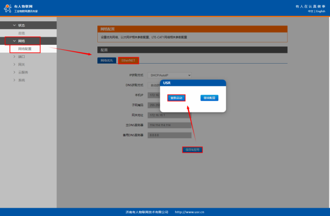12、若需要修改M100 IP, 使用工具重新搜索設(shè)備,點(diǎn)擊進(jìn)入配置界面,在 網(wǎng)絡(luò) - 網(wǎng)絡(luò)配置 - EtherNET 界面中自行修改設(shè)備網(wǎng)口ip獲取方式。