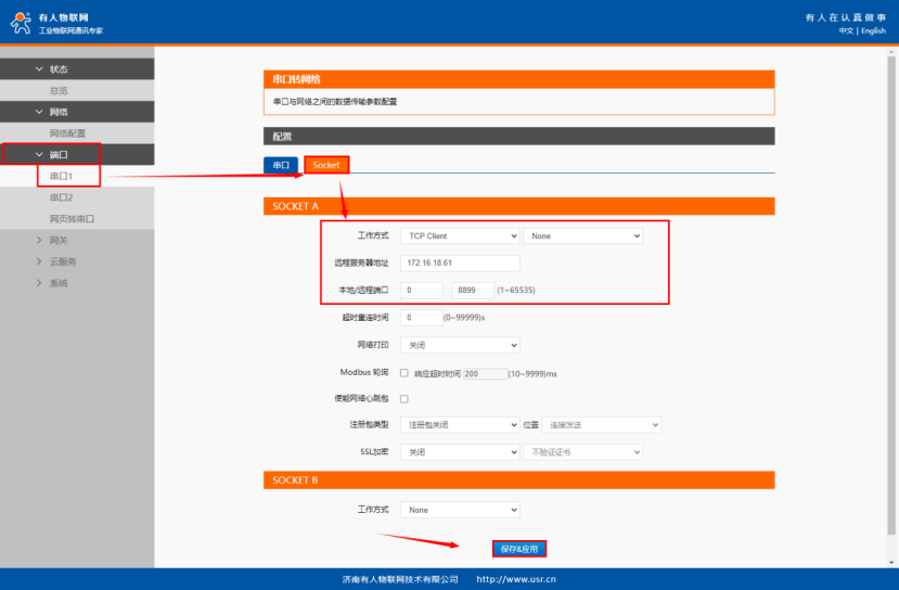 本案例測試服務(wù)器為我司 TCP服務(wù)器測試,用戶測試時(shí)請(qǐng)?jiān)凇岸丝凇?gt;“串口1” >“ Socket”界面配置自己TCP服務(wù)器的參數(shù)。
