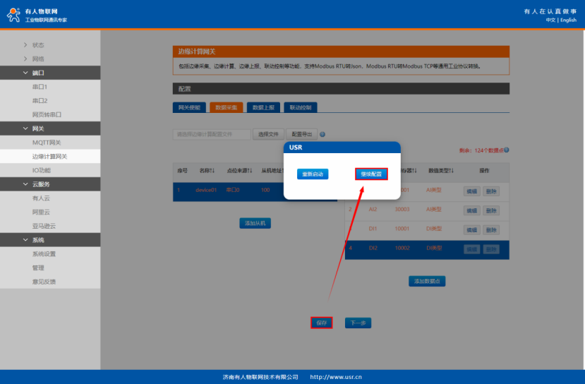 點(diǎn)擊“添加數(shù)據(jù)點(diǎn)”,分別新建DI1、DI2點(diǎn)位。點(diǎn)擊“保存”-“繼續(xù)配置”。