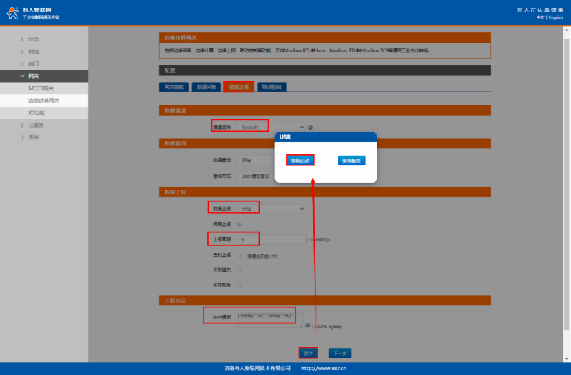 數(shù)據(jù)上報(bào)選擇“開啟”,上報(bào)周期:5s(自定義);