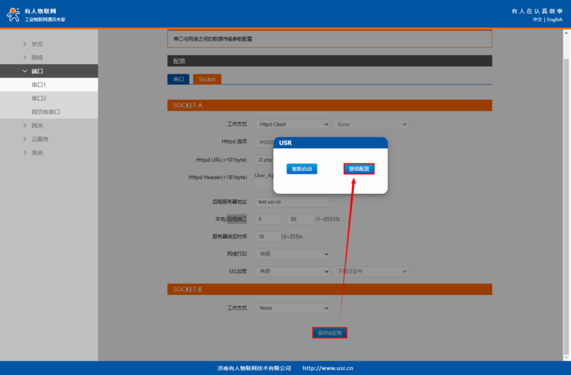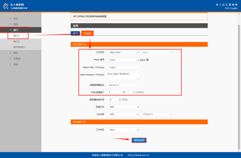 本案例測試服務器為我司 臨時http服務器測試,用戶測試時請在“端口”>“串口1” >“ Socket”界面配置自己http服務器的參數。