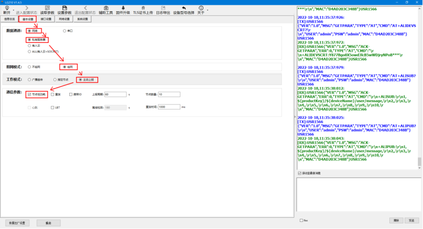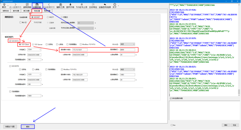 服務器IP/配置為服務器電腦的IP,服務器端口配置為服務器的端口號8899,點擊“設置參數”,點擊重啟設備,待設備重啟,服務器可以監聽到該LG210連接。