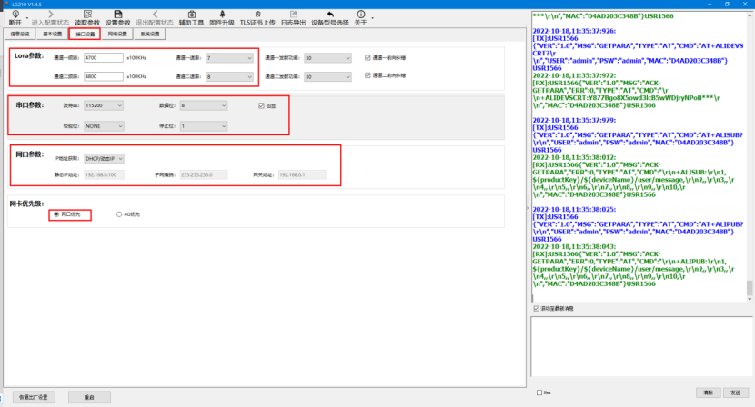 5、在接口設置中,配置Lora參數中通道一與通道二的頻率與速率參數不要一致就可以了,此處通道一二頻率分別為4700x1000Hz、4800Hz,速率分別為7、8。