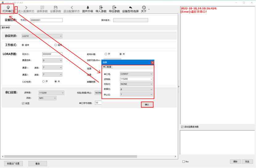 7、配置WH-L101-L-H20,L101的串口線接電腦,lora設置軟件選擇產品型號對應lora型號,點擊確認,打開對應串口的com號,串口參數默認是115200、none\8\1。