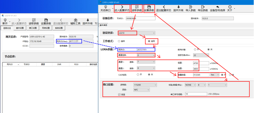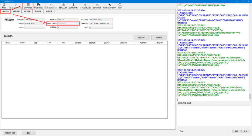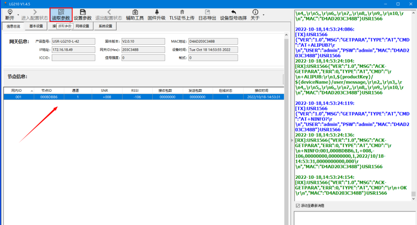 9、LG210重新獲取參數,在節點信息中可以看到添加的L101已組網成功。