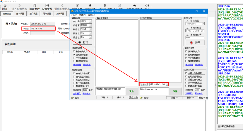在USR-TCP232-Test軟件,的串口端打開101的串口, 可測試通信。