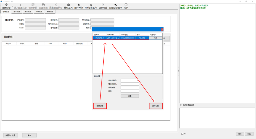 2、下載并解壓LORA設置軟件,確認LG210網口接入路由器網絡是與電腦在同一局域網內。在文件夾中選擇USR_LoRa.exe可執行文件雙擊打開,協議選擇私有協議,型號選擇LG210,點擊“連接設備”按鈕旁的下三角箭頭,選擇“網絡連接”>“搜索設備”>選擇對應LG210點擊“選擇設備”。