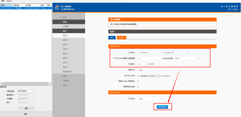 點擊端口1---串口,需要把波特率、數據位、校驗位、停止位跟串口終端設備保持一致; SOCKET參數里,選擇“Tcp server”,選擇“modbus tcp”(這個是協議轉換功能開啟),本地端口23。