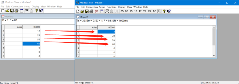 改變每個MODBUS SLAVE軟件的數據,對應的MODBUS POLL軟件就可以采集到正確的數據。