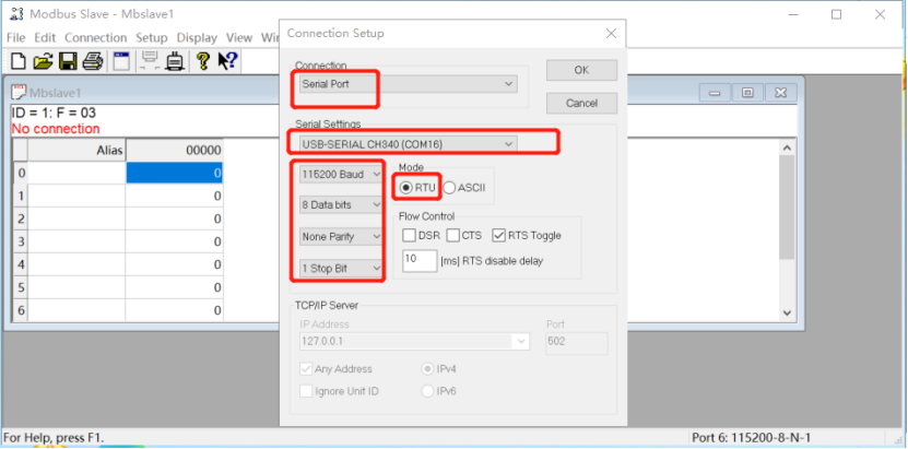 MODBUS SLAVE軟件設置串口參數,波特率、數據位、停止位、校驗位,需要和USR-N580的串口參數設置一致。