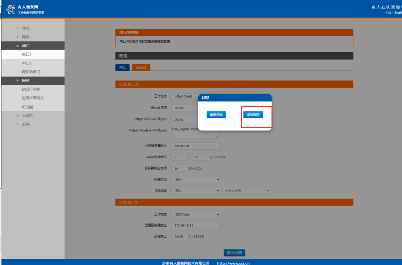 本案例測試服務器為我司 HTTP服務器測試,用戶測試時請在“端口”>“串口1” >“ Socket”界面配置自己HTTP服務器的參數。