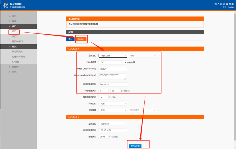 本案例測試服務器為我司 HTTP服務器測試,用戶測試時請在“端口”>“串口1” >“ Socket”界面配置自己HTTP服務器的參數。