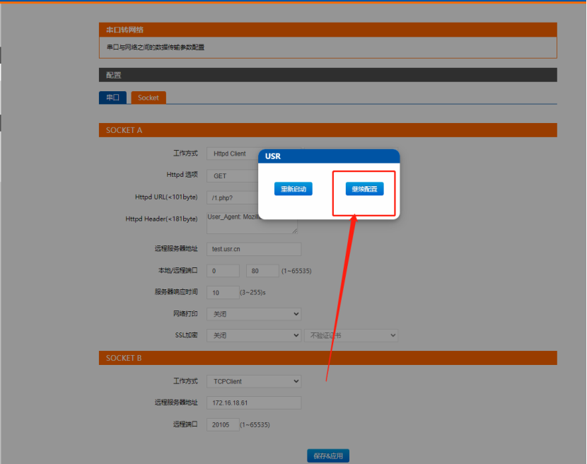 7、配置串口的波特率、校驗位、數據位等串口參數和要接的485設備一致(此處用9600為例),點擊保存應用-繼續配置。