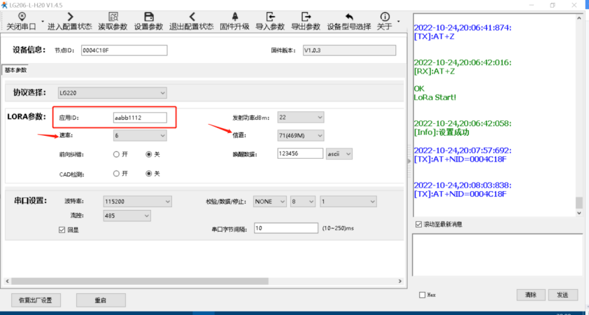 1、配置USR-LG206-L-H20的應用ID和USR-LG220的應用ID一致,USR-LG206-L-H20和USR-LG220的通道一的速率、信道一致。最后點擊一鍵設置所有參數。