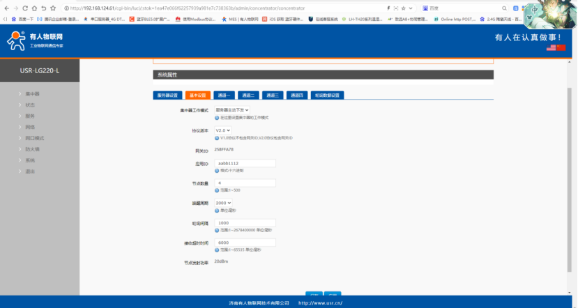 集中器工作模式:服務器主動下發。在內置網頁中網頁重啟LG220。LG220通道參數保持一致,在實際使用中可自定義。
