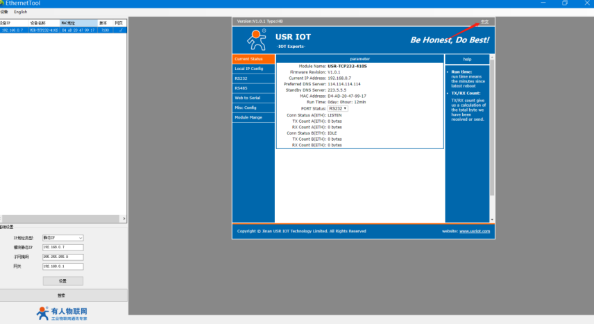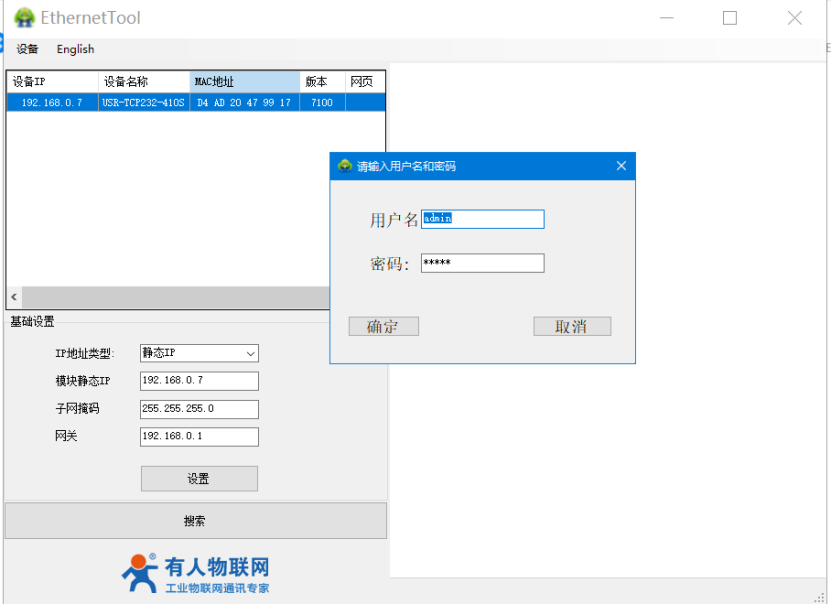 2、打開H7設置軟件,點擊搜索設備,點擊選中。雙擊IP地址,輸入用戶名admin,密碼admin,進入410s的內置網頁。點擊右上角切換至中文模式。