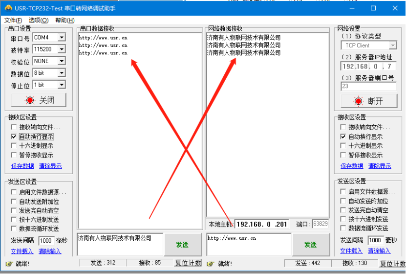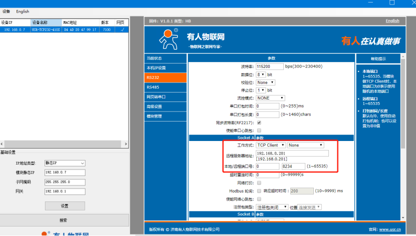 2、RS232工作方式TCP client通訊測試