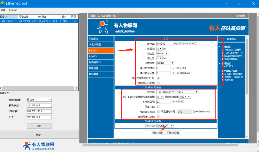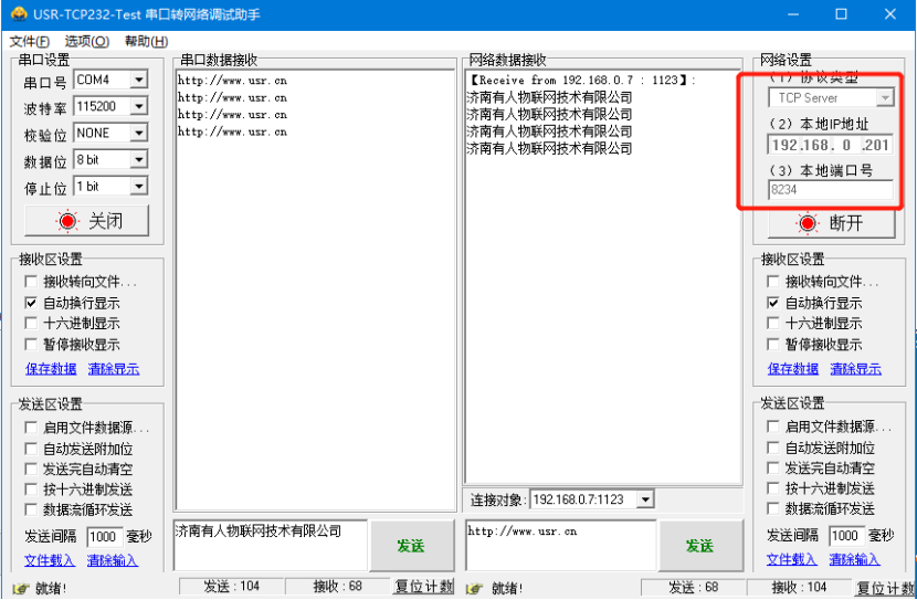 1、RS232工作方式TCP server通訊測試