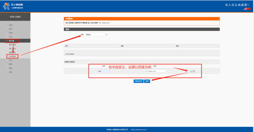 <2>連接路由器的設(shè)備將無法訪問設(shè)置的域名。注:若選擇黑名單,而未添加規(guī)則,默認(rèn)黑名單為空,即所有域名都可以訪問。