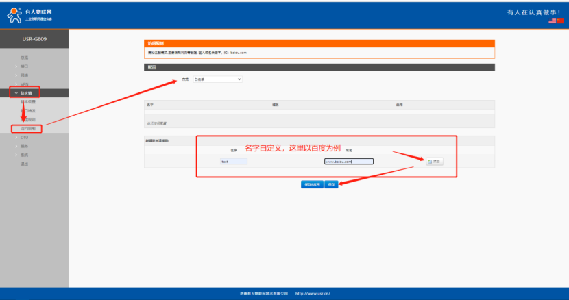 <1>方式選擇白名單,新建防火墻規(guī)則中名字可自擬,域名即為要放行的正確域名,點(diǎn)擊添加,然后點(diǎn)擊報(bào)保存,規(guī)則立即生效。