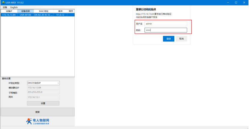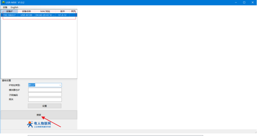 (3)打開M100的配置軟件,點擊搜索,搜索到M100,默認IP是192.168.0.7,雙擊設備IP,然后將IP地址類型改為DHCP/動態IP。