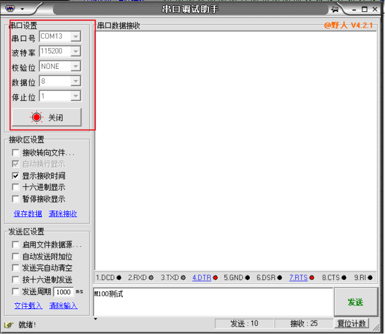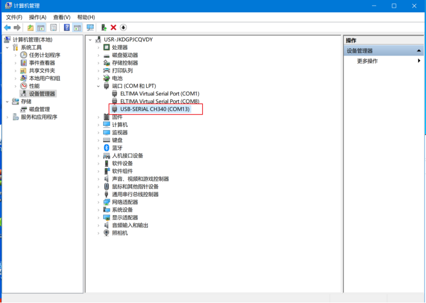 (2)檢查USR-RS485串口線的COM口號,點擊電腦計算機,右擊鼠標,點擊設備管理器,查看端口,確認USB-RS485串口線的COM口號,有人測試電腦是COM13,按照M100串口1默認串口參數波特率115200,數據位8位,停止位1位,校驗位無,使用串口助手打開對應的串口。COM13