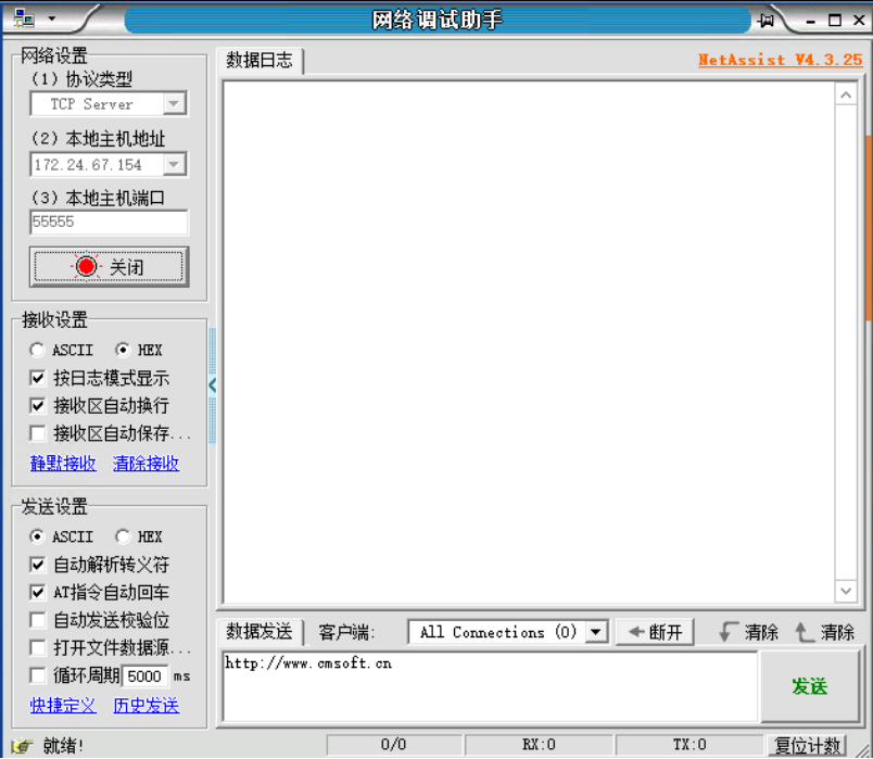 先在服務器端打開一個網絡調試助手,設置成TCP server及本地端口號(這里設置成55555),點擊打開。