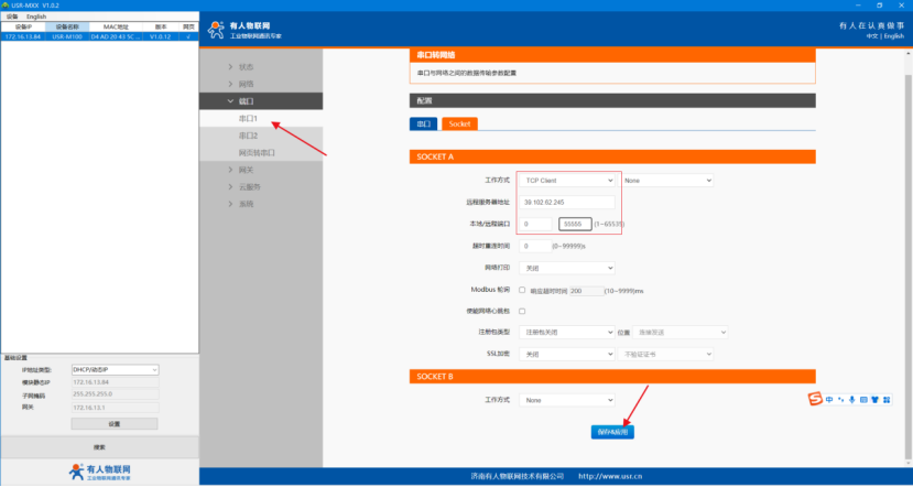 (5) 設置端口的工作方式選擇TCP Client,目標IP:39.102.62.245(客戶想要連接的服務器的IP地址),遠程端口號:55555(根據客戶的服務器地址填寫),設置完成后點擊端口1設置保存參數,設備重啟使參數生效。