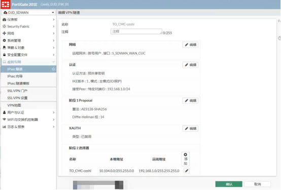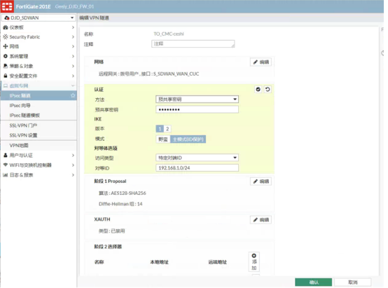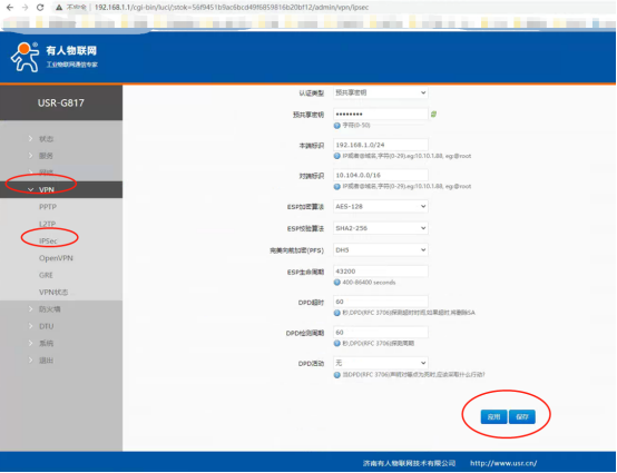 注意:飛塔服務器的對端標識必須設置為IP,服務器和路由器設置一致即可,客戶端(即USR-G817)的對端標識可以不寫。