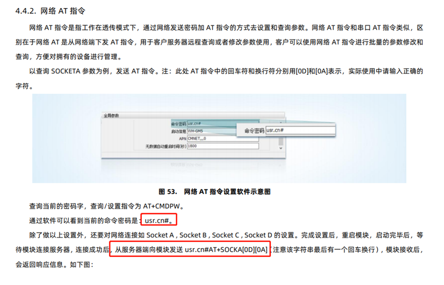 1) 打開設備對應的說明書,找到關于網絡AT指令章節,看一下網絡AT指令格式