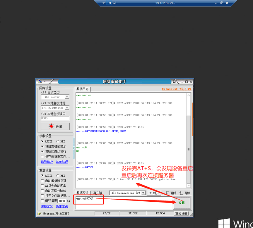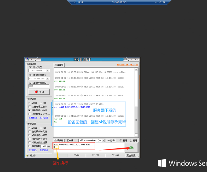 3)將修改串口參數的AT指令輸入到發送框(注意此處服務器下發數據要以ASCII形式下發),AT指令最后要添加一個回車換行
