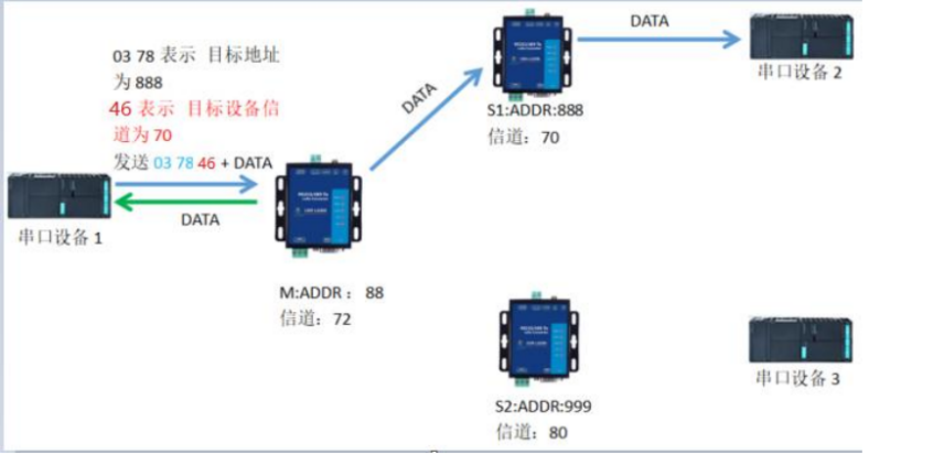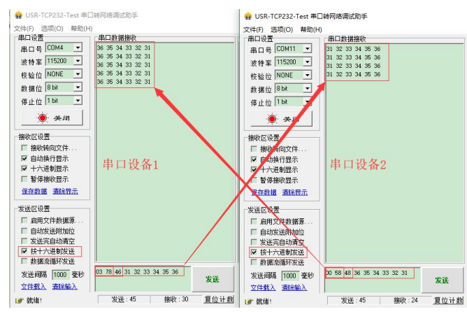 打開兩個 USR-TCP232-Test(模擬串口設備 1,2)分別連接 LoRa 數(shù)傳終端 A、B 的串口,使用串口設備1發(fā)送數(shù)據(jù)串口設備2可接收數(shù)據(jù)(反之亦然),調(diào)試結果如下圖所示:
