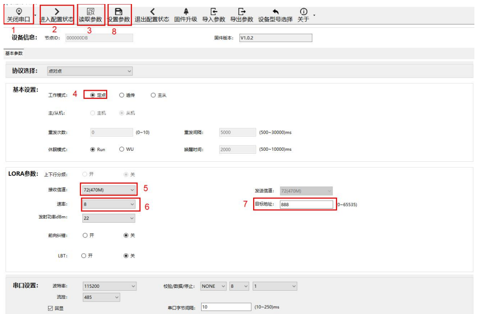 2、下載并打開產(chǎn)品的設置軟件,使用設置默認的串口參數(shù)(115200 N 8 1)打開電腦生成的com口,點擊進入配置狀態(tài)并讀取設置參數(shù)。