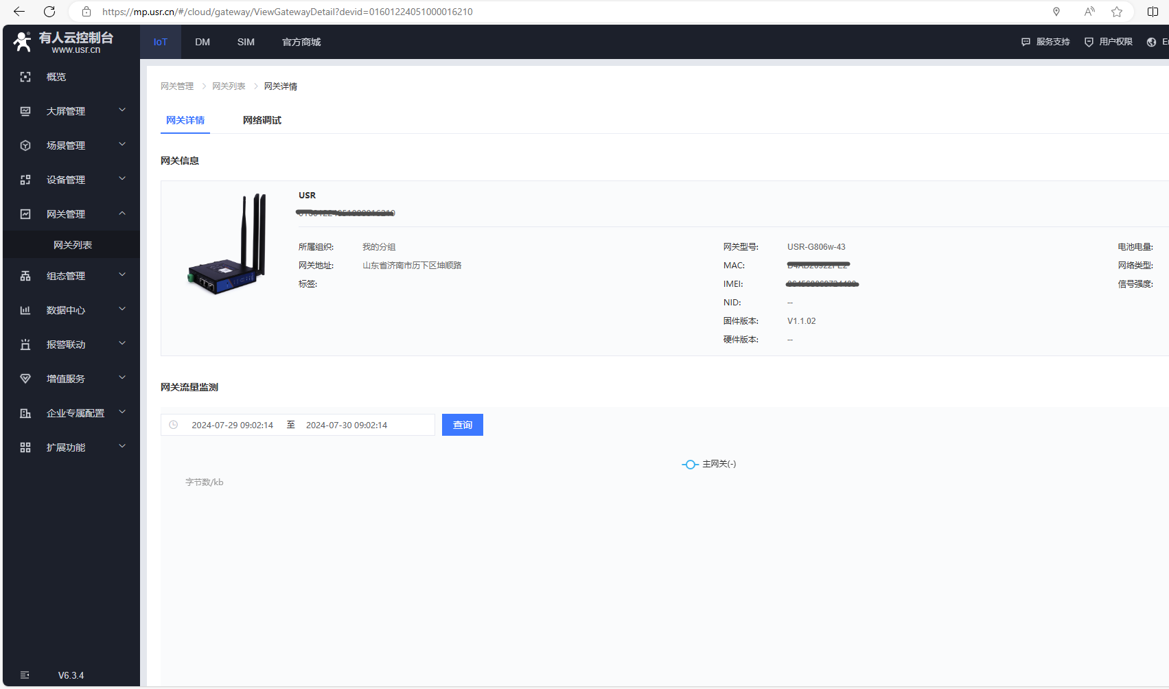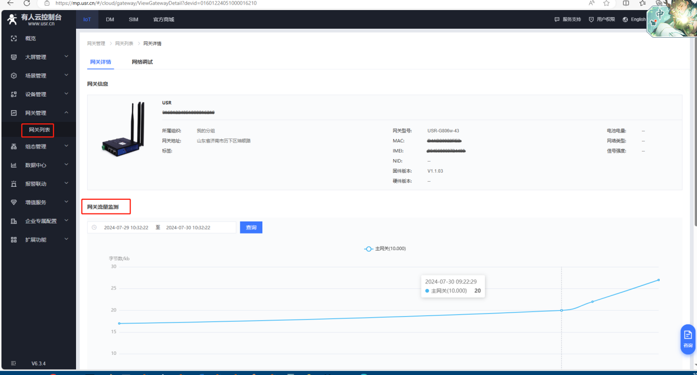 IOT平臺,點擊網(wǎng)關管理,點擊網(wǎng)關列表,可以從網(wǎng)關流量監(jiān)測,檢測流量。