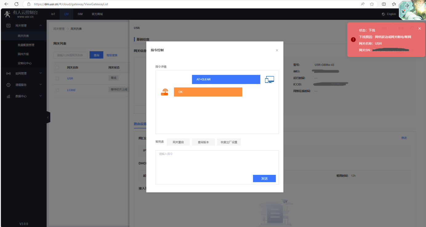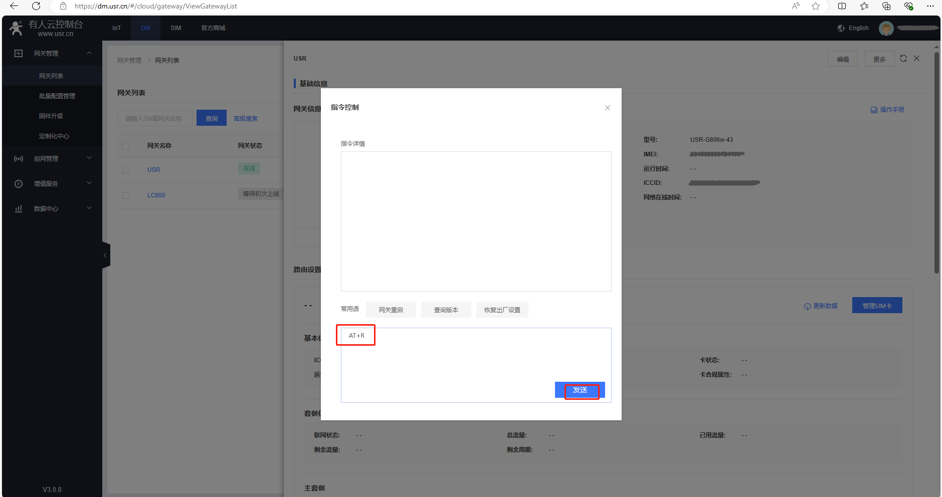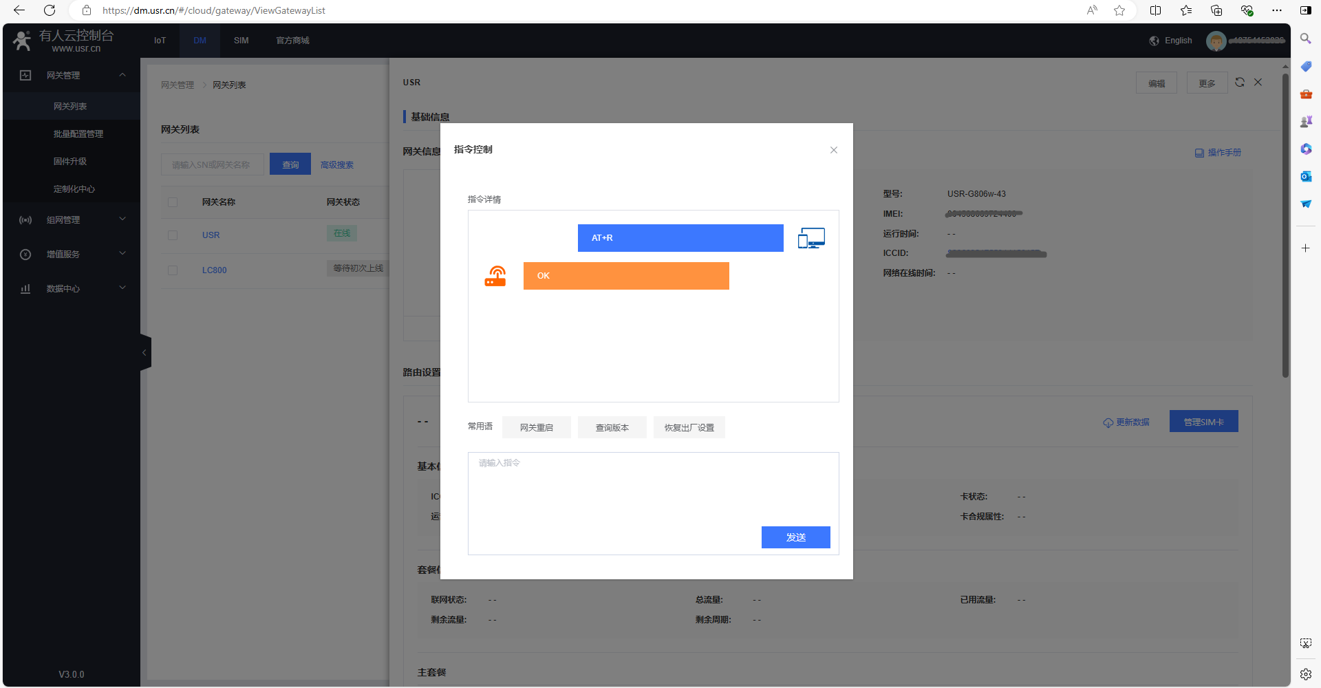 (1)在指令控制彈框,發(fā)送AT+R重啟USR-G806w的AT指令,網(wǎng)關重啟。
