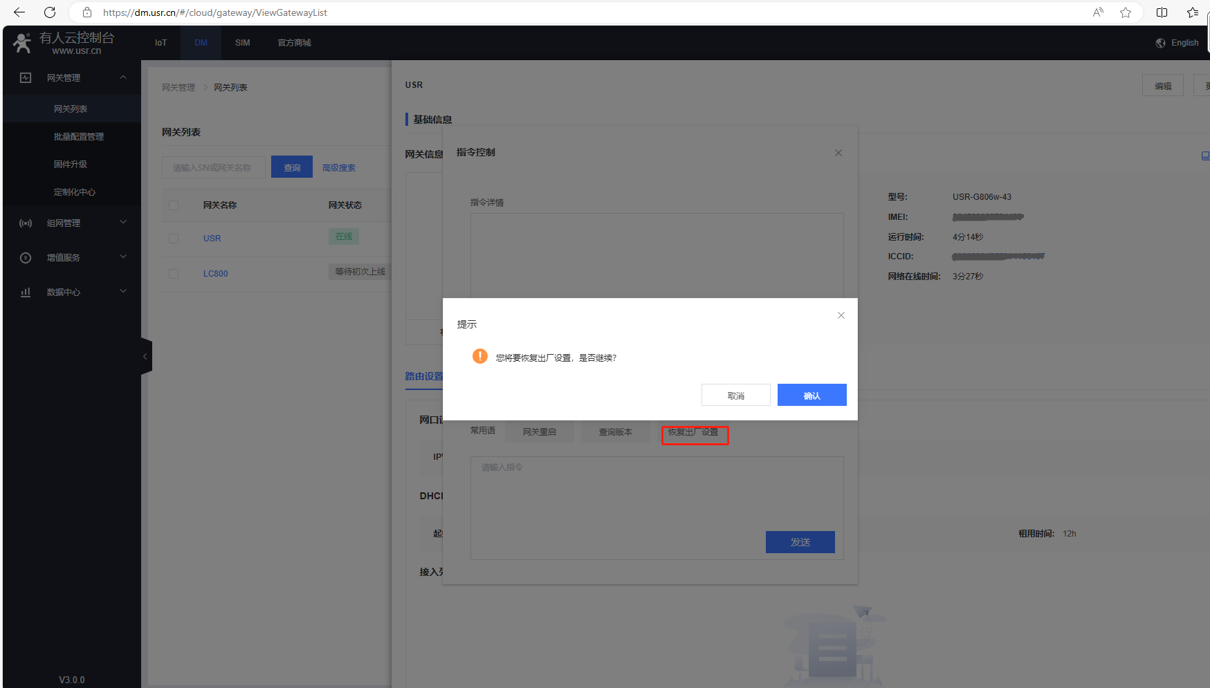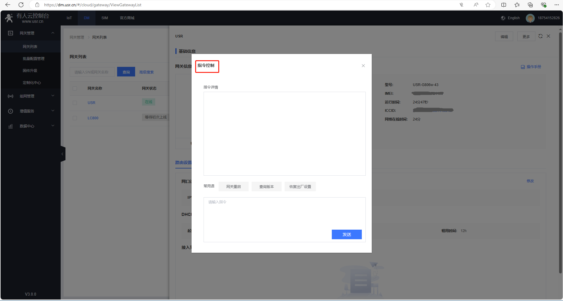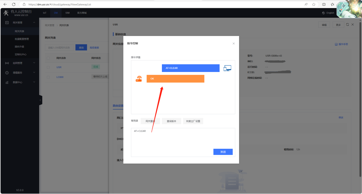 (1)在指令控制彈框,發(fā)送AT+R重啟USR-G806w的AT指令,網(wǎng)關重啟。