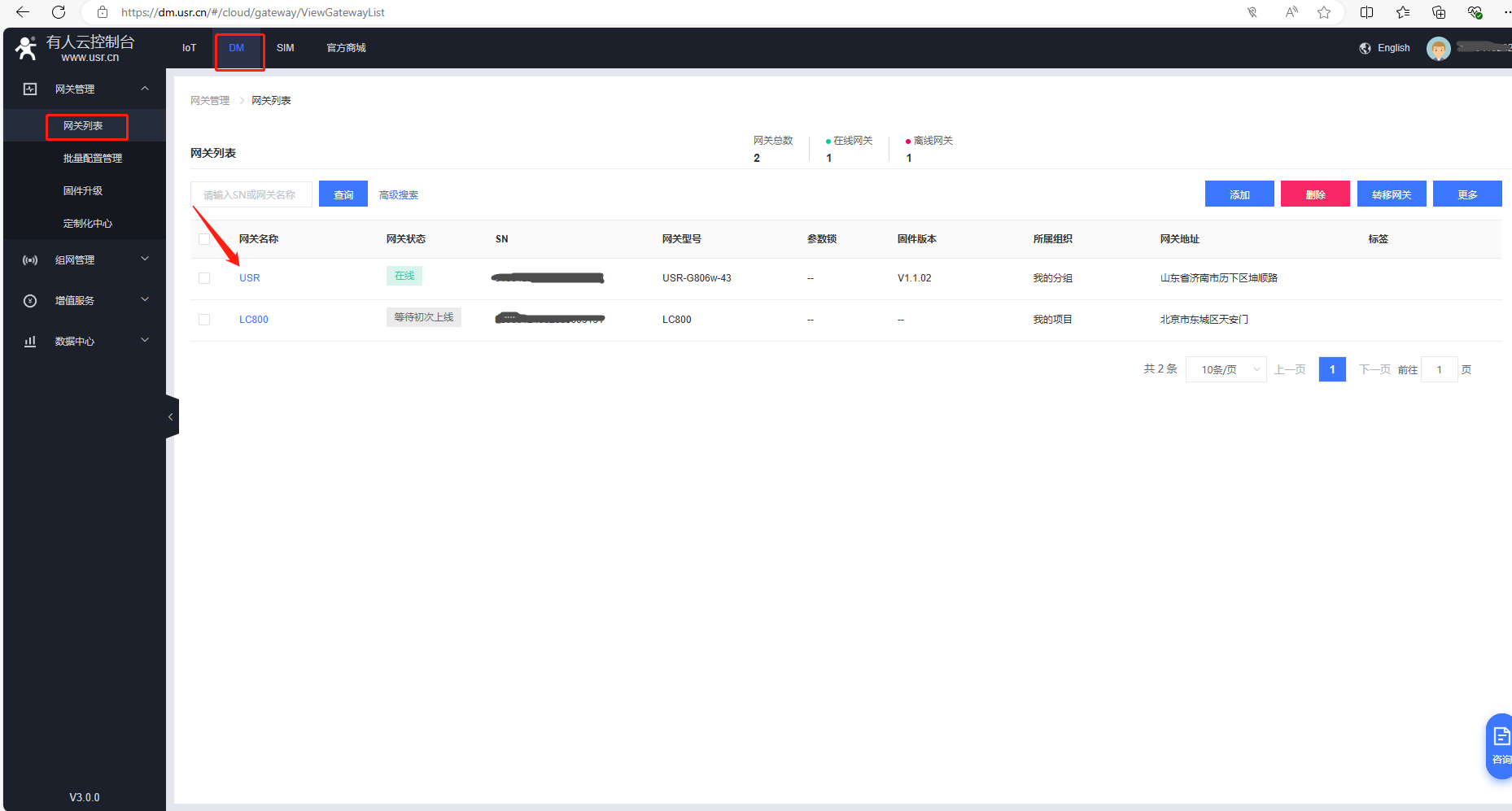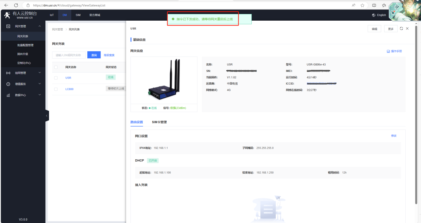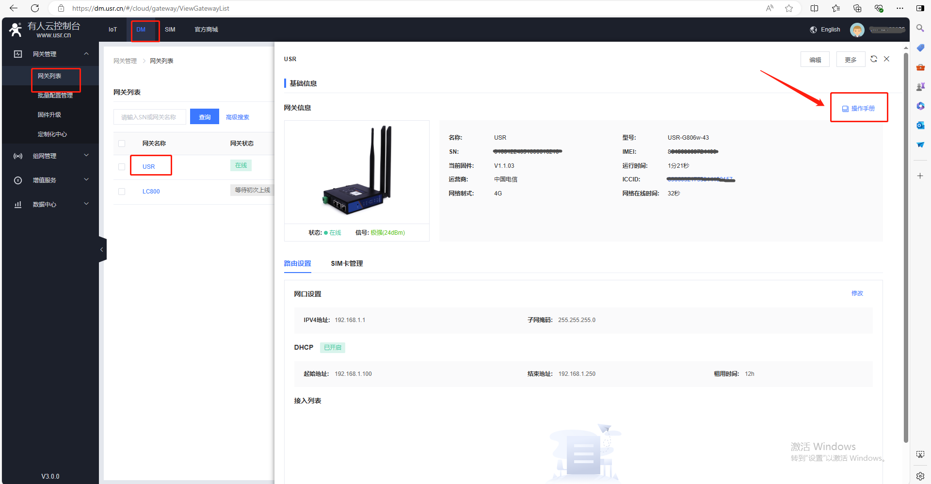 DM平臺,點擊網(wǎng)關管理,點擊網(wǎng)關列表,點擊網(wǎng)關名稱,在展示的信息,可以點擊操作手冊,跳轉到路由器的說明書。