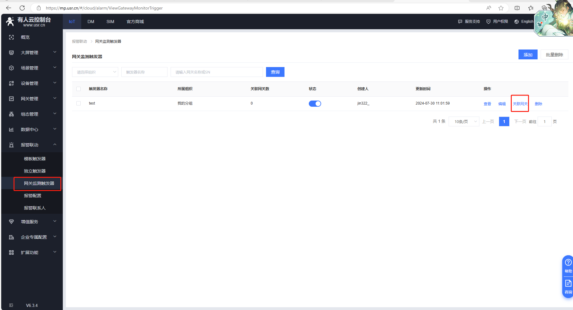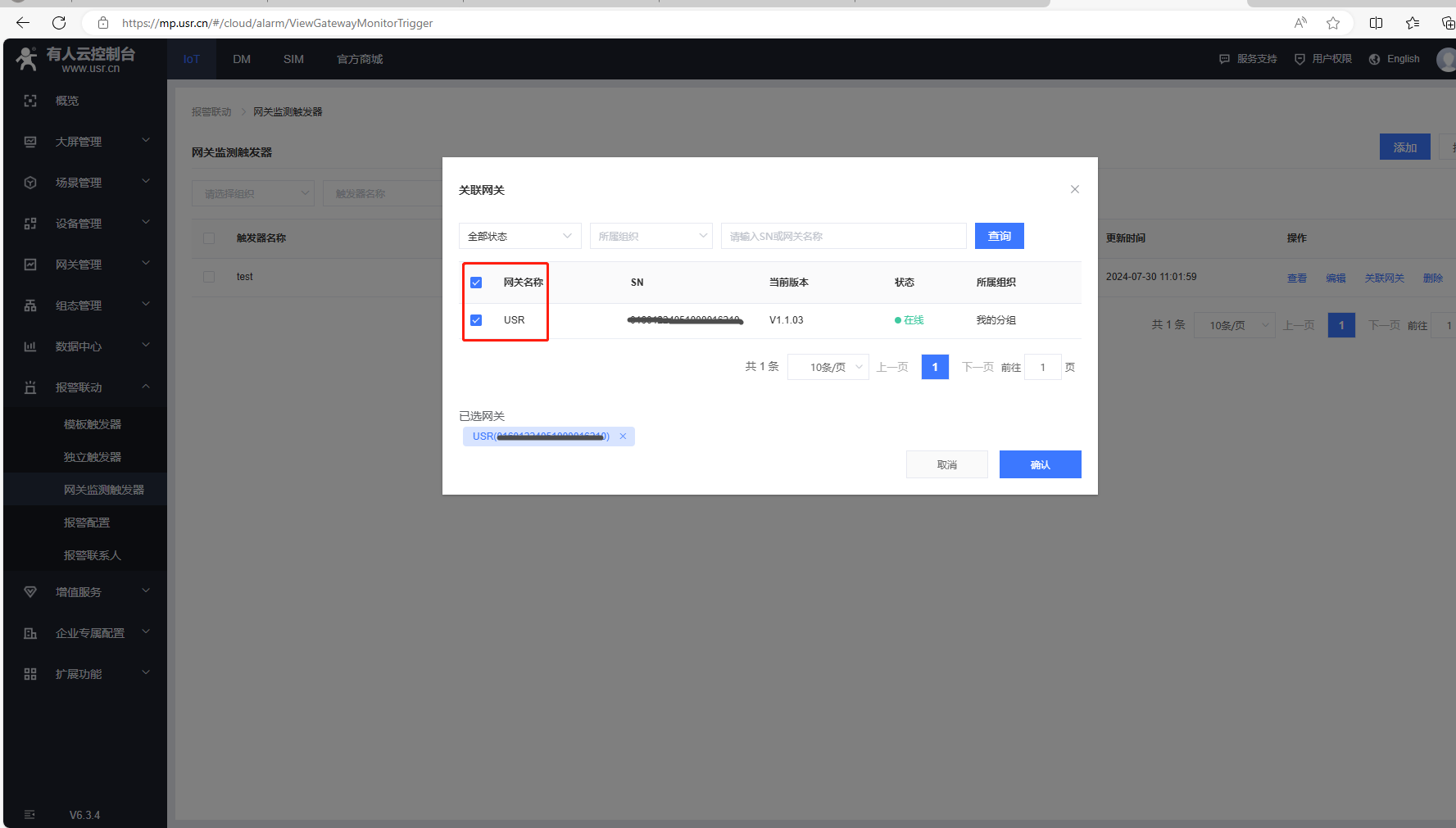 (2)IOT平臺,點擊報警聯(lián)動,點擊網(wǎng)關監(jiān)測觸發(fā)器,點擊關聯(lián)網(wǎng)關。勾選路由器網(wǎng)關,點擊確認。