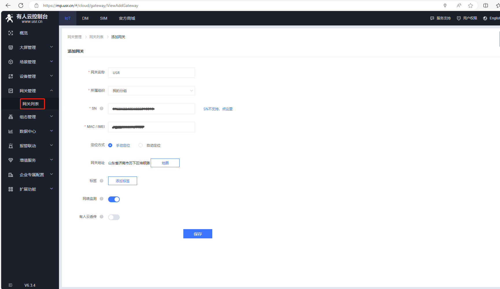 (2)支持SN上云的路由器產品,可以用產品標簽上的SN和IMEI,添加網(wǎng)關,點擊保存。