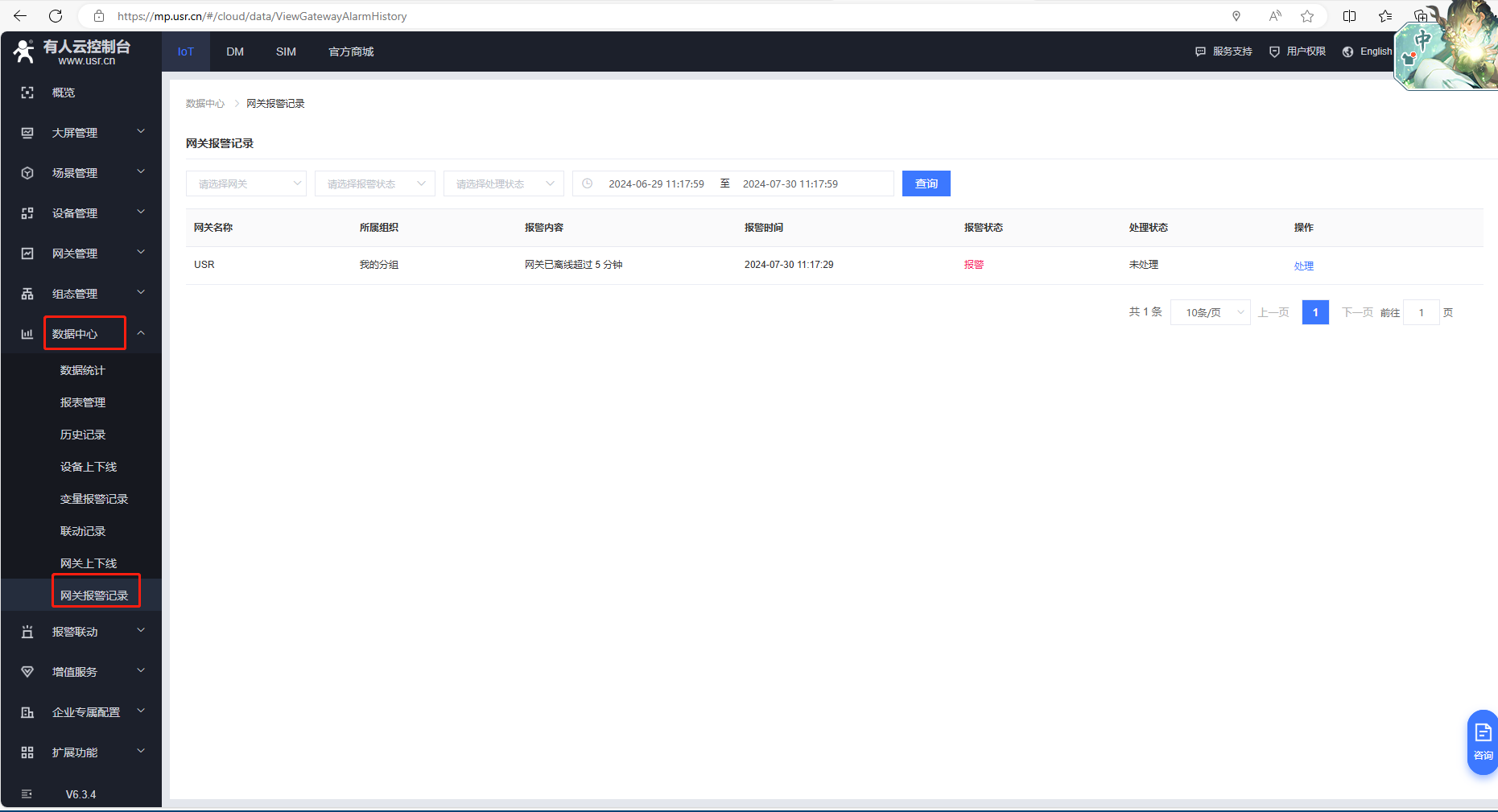 (4)IOT平臺,點擊數(shù)據(jù)中心,點擊網(wǎng)關報警記錄,可以查看網(wǎng)關報警記錄,報警狀態(tài)和處理狀態(tài)。