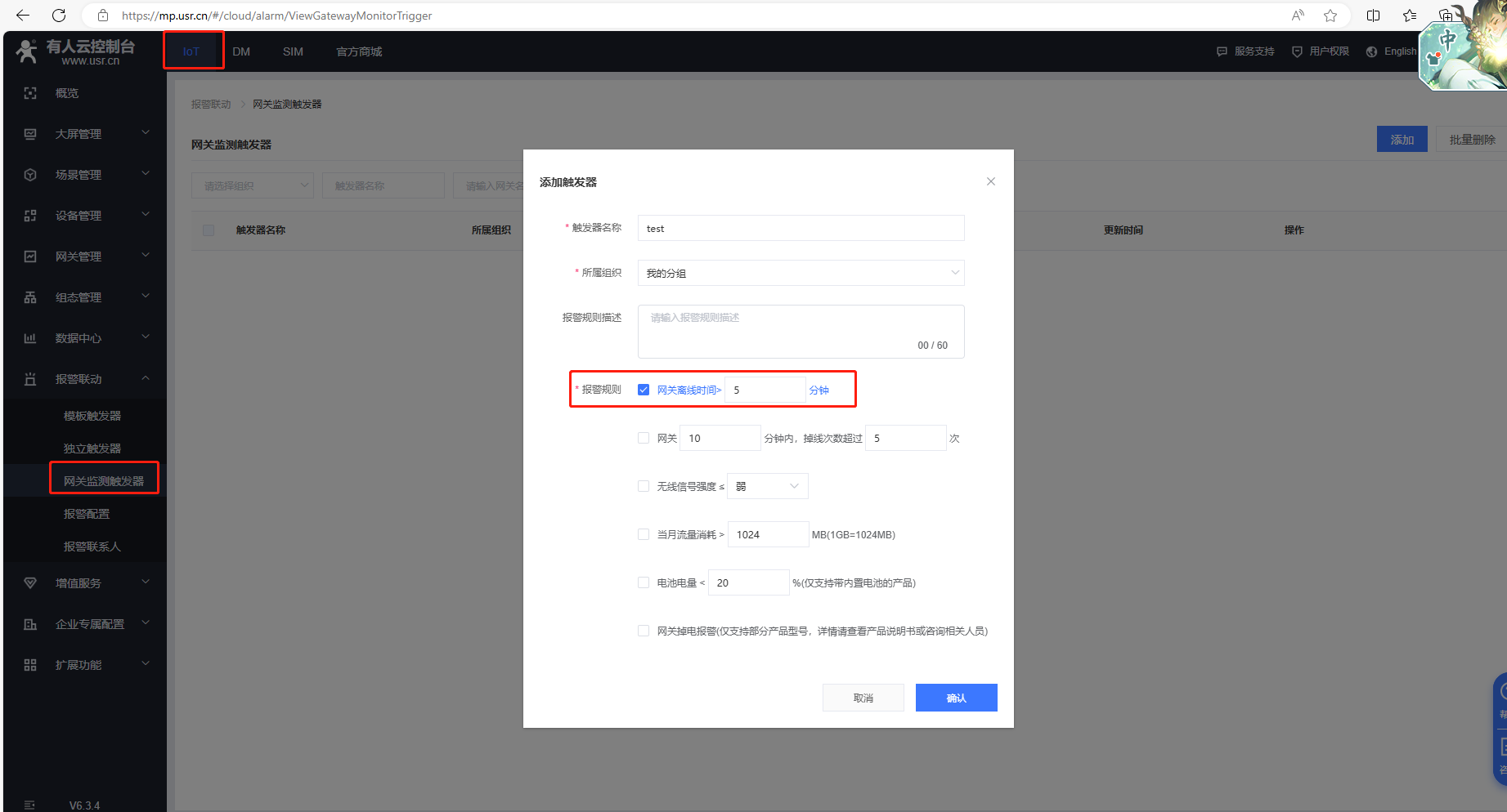 (1)IOT平臺,點擊報警聯(lián)動,點擊網(wǎng)關監(jiān)測觸發(fā)器,點擊添加,按照實際需要,設置報警規(guī)則,舉例,這里設置的是網(wǎng)關離線時間大于5分鐘,報警。