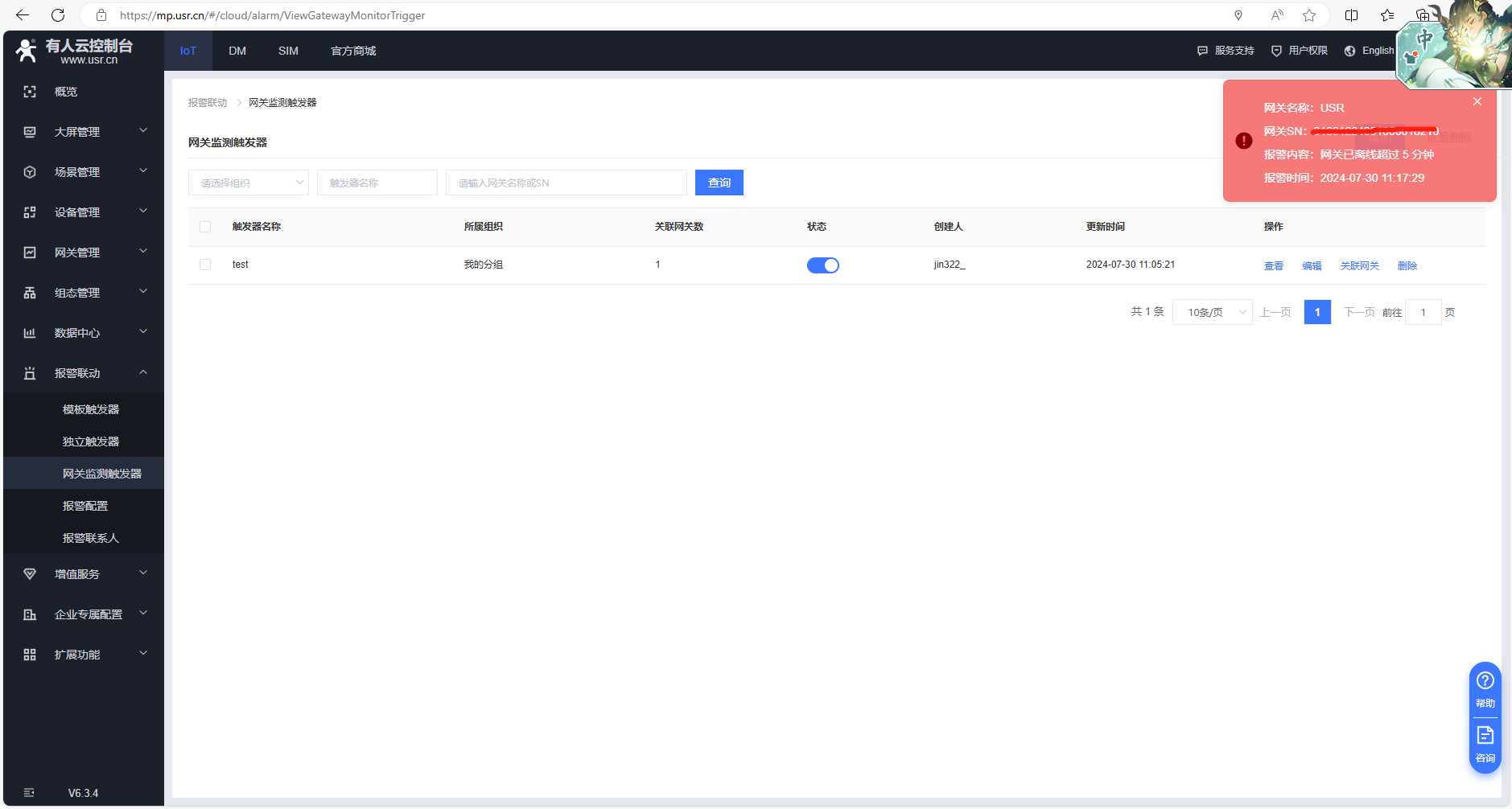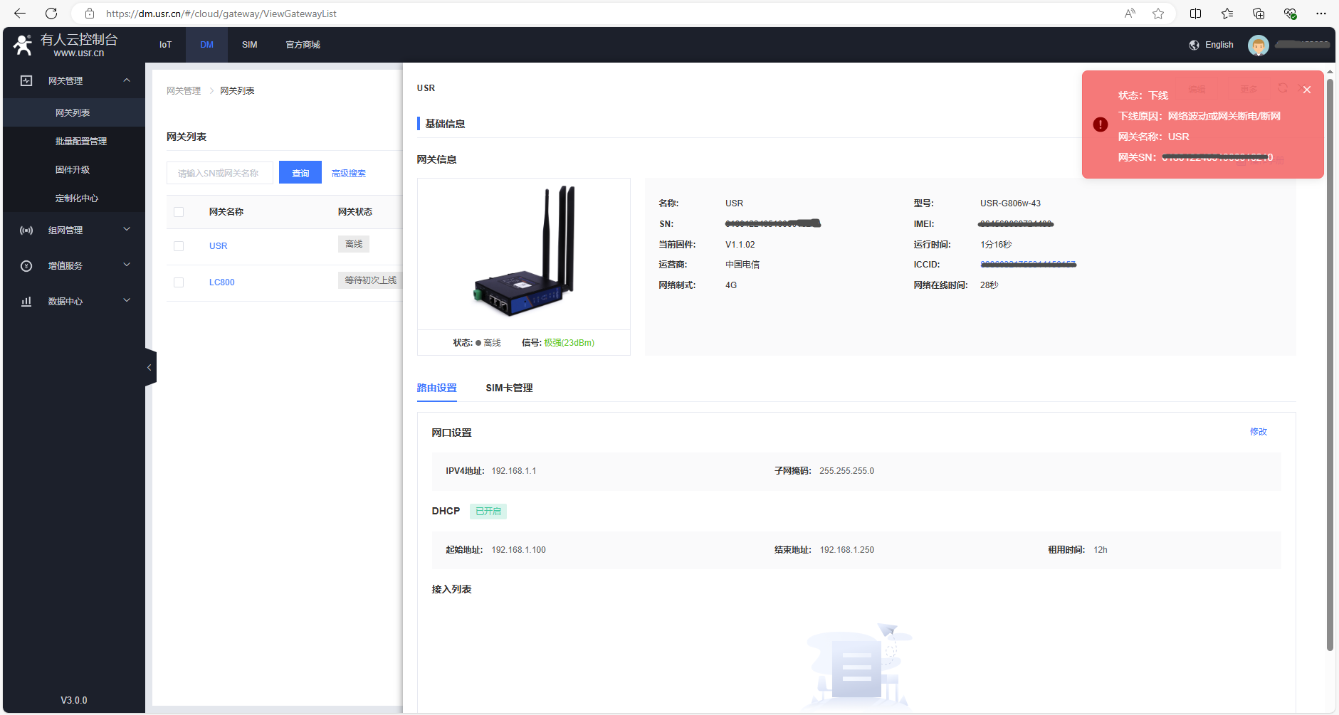 (3)將路由器斷電,會從有人云離線,等離線時間大于5分鐘,用人云收到一條報警信息,網(wǎng)關已離線超5分鐘。