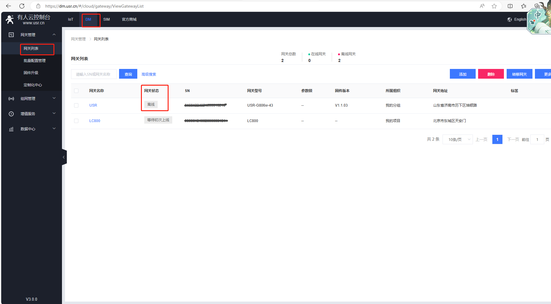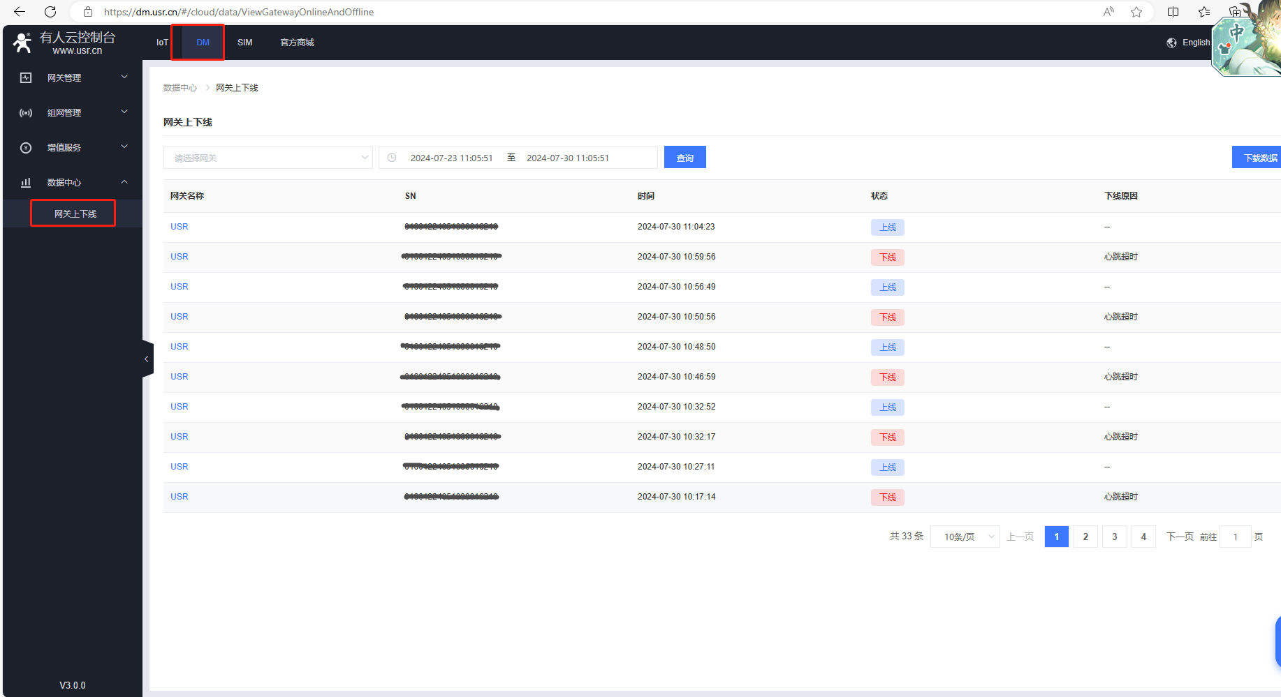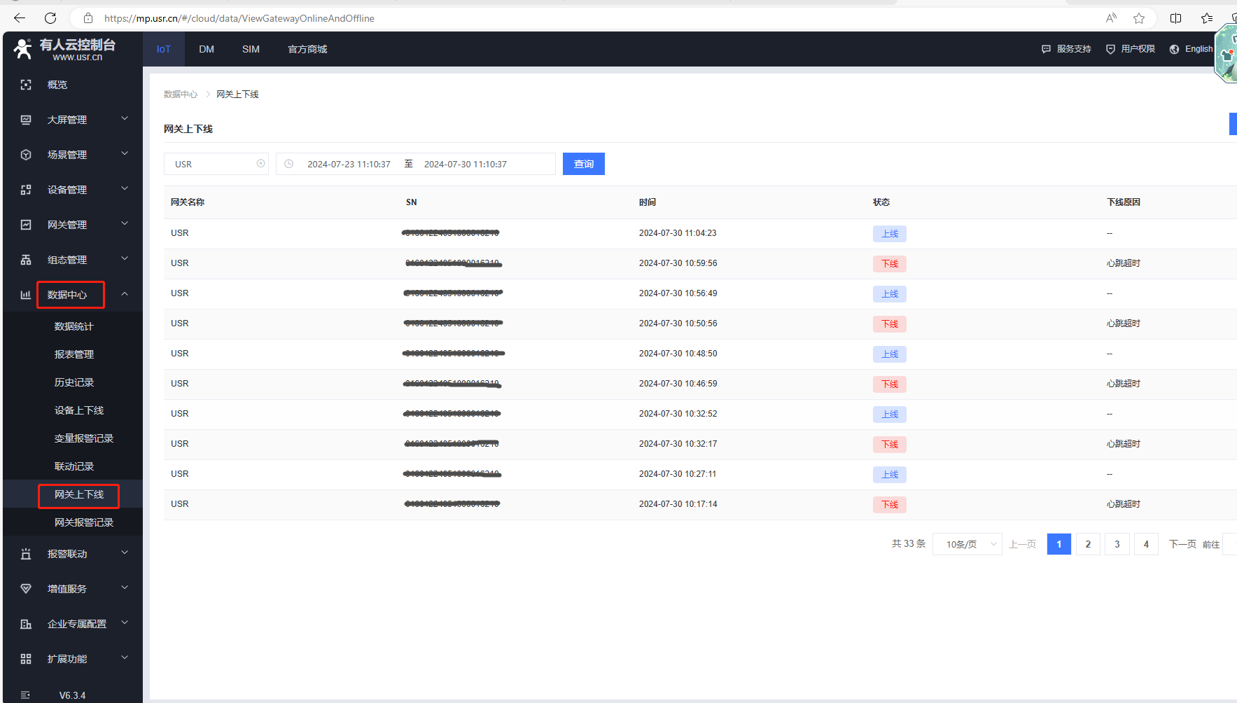 (1)DM平臺,點擊數(shù)據(jù)中心,點擊網(wǎng)關上下線可以查看網(wǎng)關的上下線記錄。