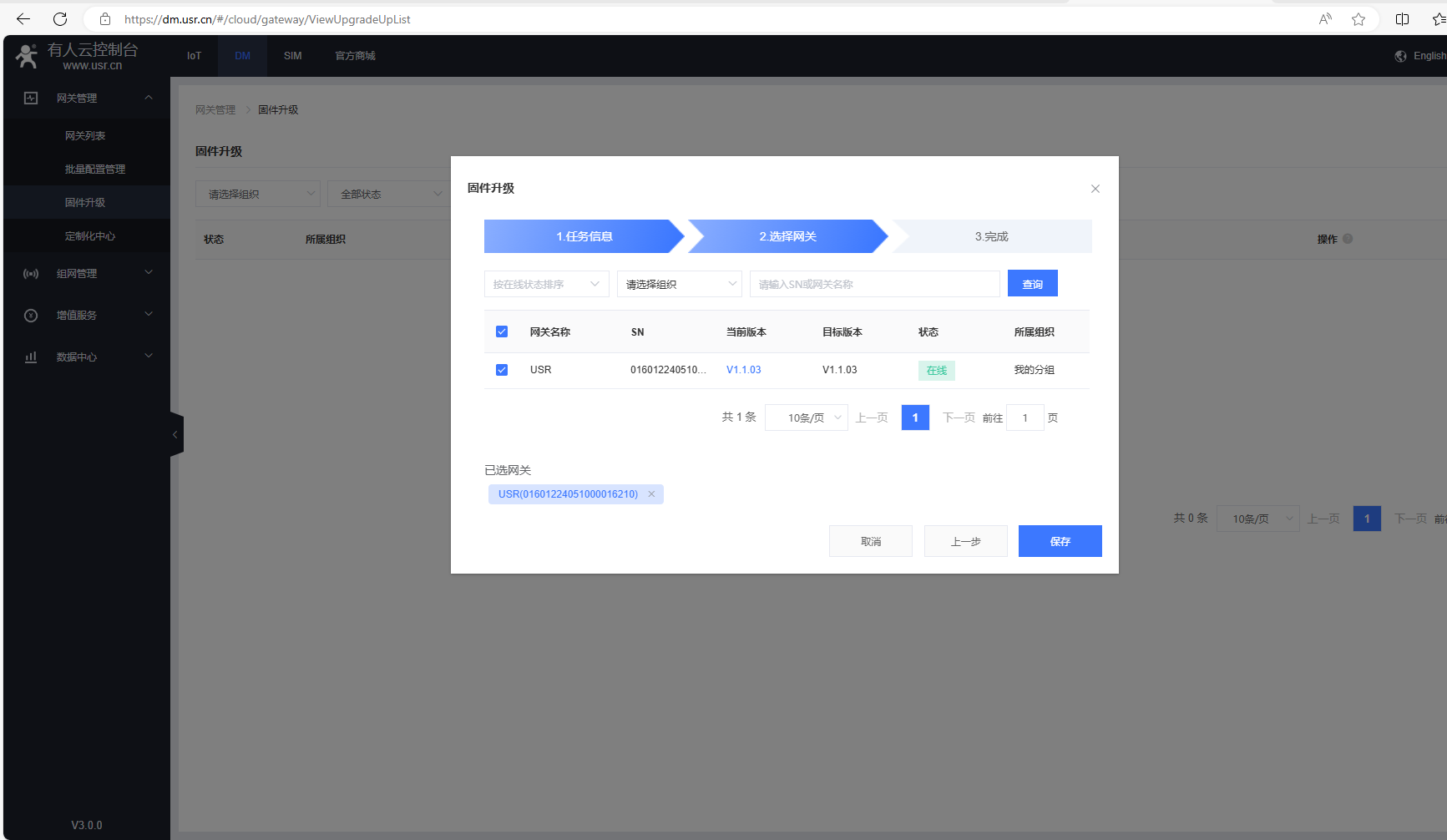 (1)點擊網(wǎng)關管理,點擊固件升級,按照步驟,選擇網(wǎng)關型號,選擇固件升級版本,點擊下一步,勾選網(wǎng)關,點擊保存,最后點擊確認。