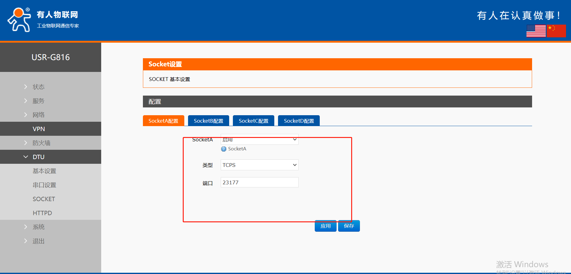 開啟SOCKET功能,類型為TCPS 以及端口號(23177),然后點擊應用。