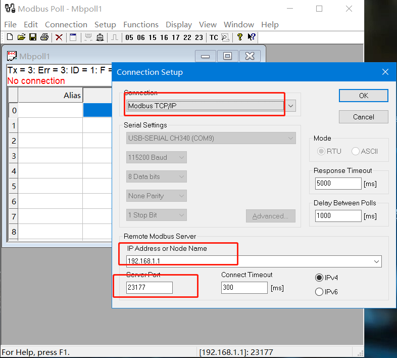 1、使用modbusPOLL 模擬上位機,做modbusTCP client端。連接G816 DTU的IP和端口。