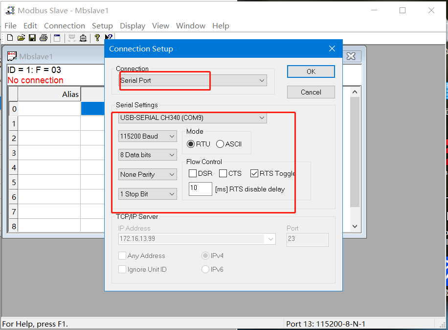 3、檢查本案例中使用modbus slave的串口參數是否與816串口參數保持一致。(若接串口設備,檢查串口設備和816的串口參數是否一致)