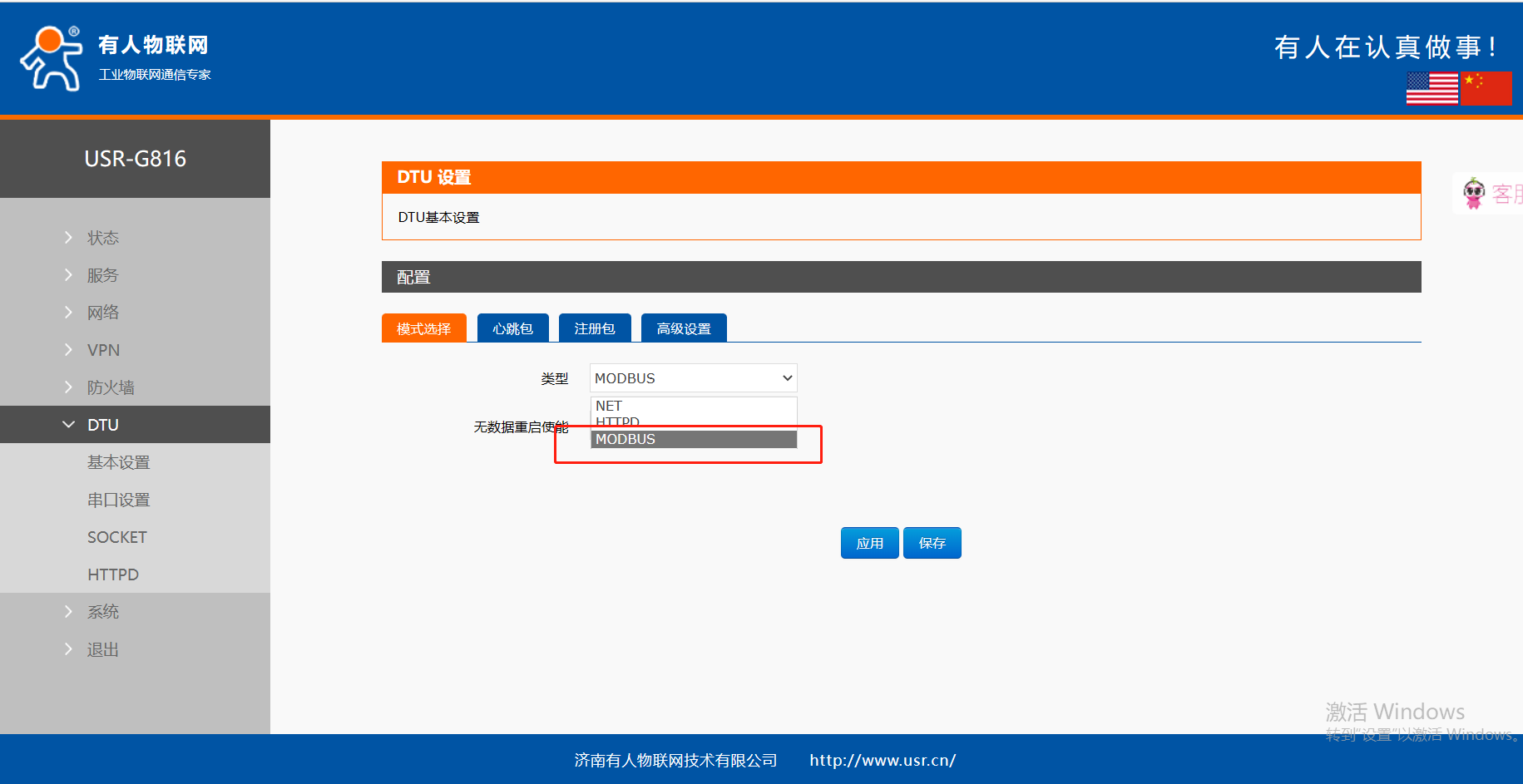 2、打開內置網頁--DTU功能設置界面--類型:modbus。